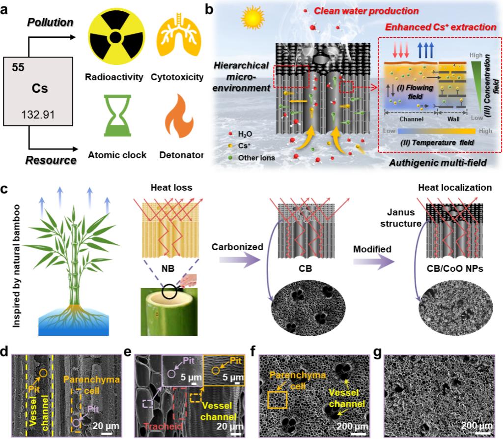 Figure 1. a) Overview of Cs element: environmental impacts, health hazards, and resource utilization. b) The working principle of the designed BSSM. c) Schematic showing the BSSM assembly process inspired by natural bamboo. d-e) SEM images of the longitudinal cross-sections of NB and CB demonstrate CB's hierarchical structure retention. f-g) SEM images of CB and CB/CoO NPs-based BSSM.