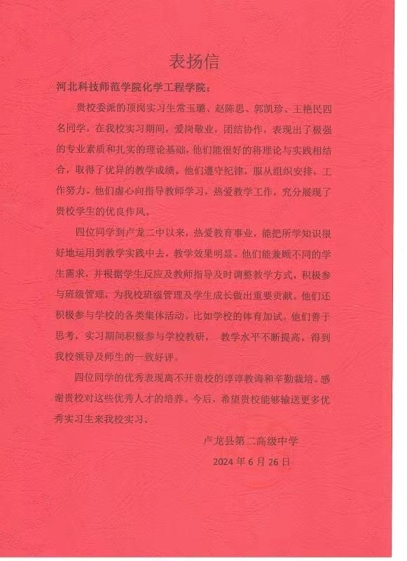 此次教育实习,历时16周,公司员工得到了实习公司的充分认可与肯定,南戴河中学、卢龙县第二高级中学分别给公司发来锦旗和感谢信。